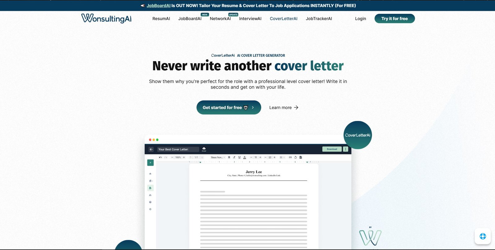 ما هو CoverletterAI من Wonsulting؟ CoverLetterAI هي أداة ذكاء اصطناعي تولد خطابات تقديمية خالية من العيوب واحترافية لزيادة فرصك في الحصول على وظيفة. تعمل عن طريق تحديد سيرتك الذاتية والمعلومات ذات الص... See More